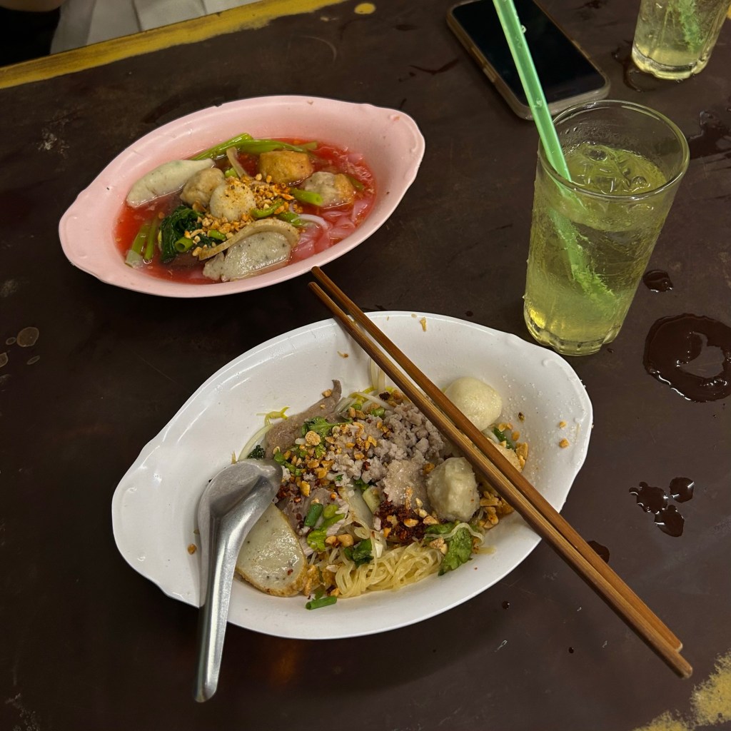 お店の代表的メニューは「เย็นตาโฟ Yen Ta Fo (イェンターフォー)」。ここでしか味わえない独自のレシピで作られたソースが絡んだ絶品麺料理をメインに、サイドディッシュとして「ลูกชิ้นลวก(煮つくね)」も一緒に注文してみて。私の個人的な一押しメニューは「บะหมี่แห้งซีอิ้วใส่เกี๊ยวกุ้ง(エビワンタン醤油麺)」。このお店のワンタンは本当に大きくて食べ応え十分!