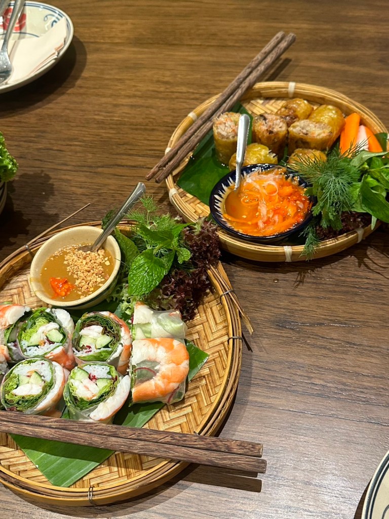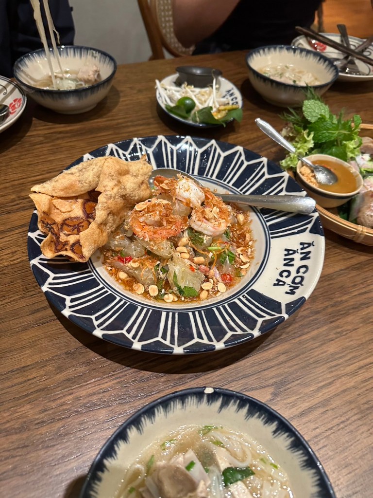 「早起き」の定義がお昼前後で起床後すぐに何か食べたい人にぴったりのお店で、「เป๊าะเปี๊ยะกุ้งสด 生海老の春巻き」「เฝอフォー」「 หมูย่างใบชะพลู 豚肉のチャープルー葉添え」「กุ้นพันอ้อย 海老のサトウキビ包み」など、なにを頼んでも全て美味しい。